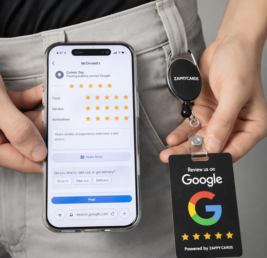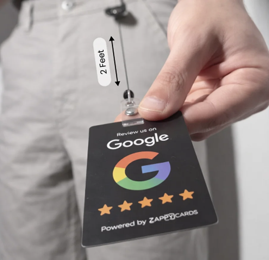 Zappycards uses NFC technology, which allows customers to leave reviews by simply tapping their phone on our stand or card. It's quick and easy! We use the same technology as Apple Pay or Google Pay **ZappyCards are not affiliated with Google. Our cards are tools to optimize results and make it easy for your customers to leave you a review on this platform.